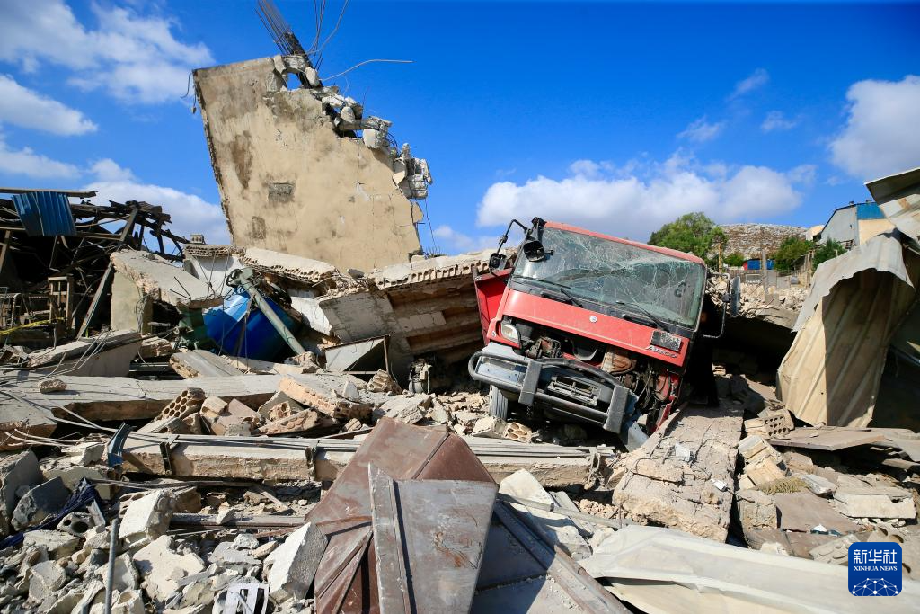 这是8月17日在黎巴嫩奈拜提耶拍摄的在以色列空袭中被毁的建筑和卡车。新华社发(阿里·哈希绍摄)