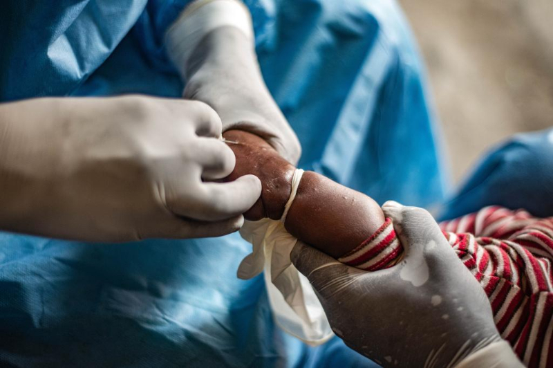 8月15日,在刚果(金)北基伍省首府戈马市附近尼拉贡戈地区的一座医院里,医务人员对感染猴痘病毒的儿童进行治疗。新华社发(扎南摄)