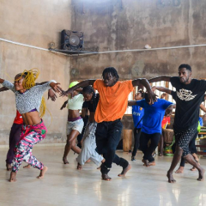 在喀麦隆首都雅温得市郊一间舞蹈练习室内,一群年轻的非洲演员正身着当地服装、头戴面具,伴随着传统乐器的节奏赤脚舞蹈。