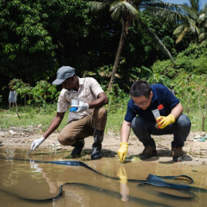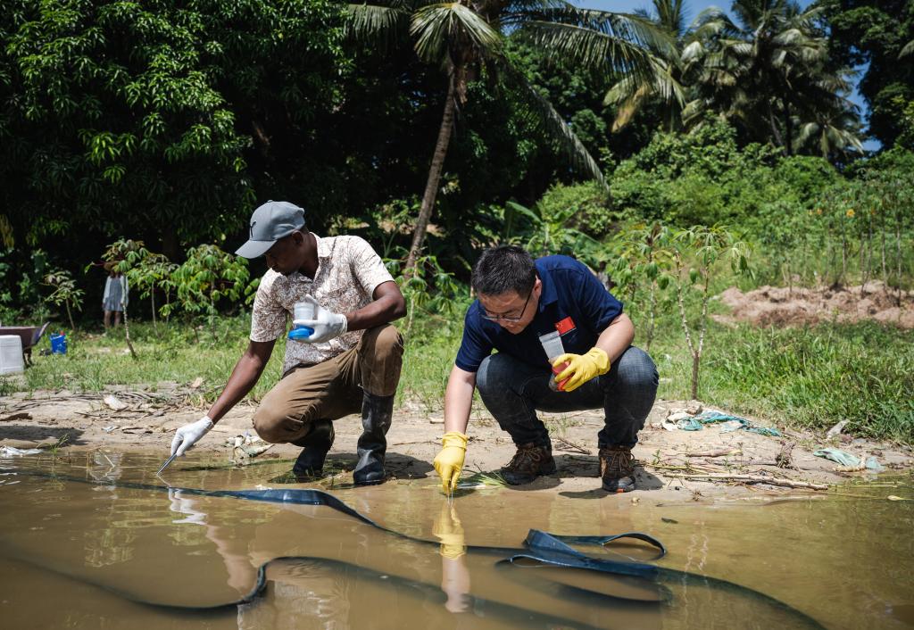 2024年1月1日,中国援助桑给巴尔血吸虫病防治技术项目专家组成员王鑫瑶(右)在坦桑尼亚桑给巴尔的奔巴岛开展血吸虫消杀工作。新华社记者 王冠森 摄