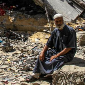 8月22日,在加沙地带北部城镇拜特拉希亚,人们聚集在一幢遭袭房屋的废墟附近。