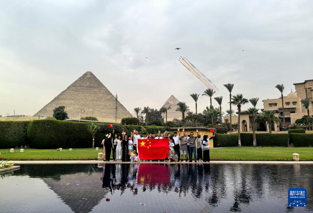 当地时间28日中午,中国空军1架运-20与空军八一飞行表演队6架歼-10表演机编队飞越金字塔上空,歼-10表演机在空中拉出象征中埃两国国旗颜色的6道彩烟,吉萨金字塔景区内的观众争相合影留念。