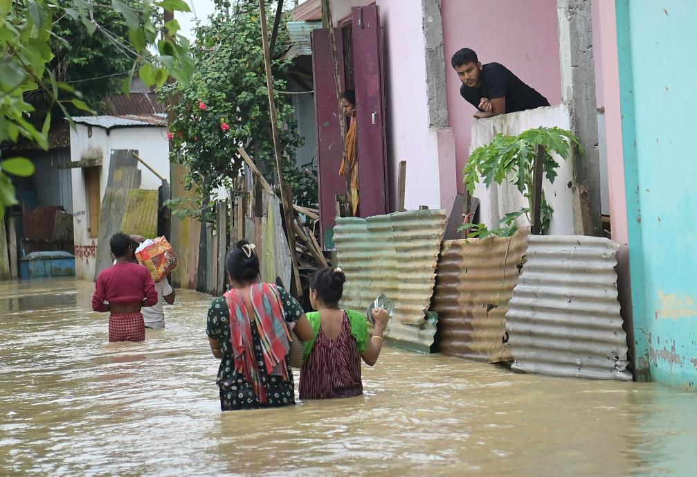 8月20日,在印度阿加尔塔拉市郊,人们走在积水的道路上。新华社发