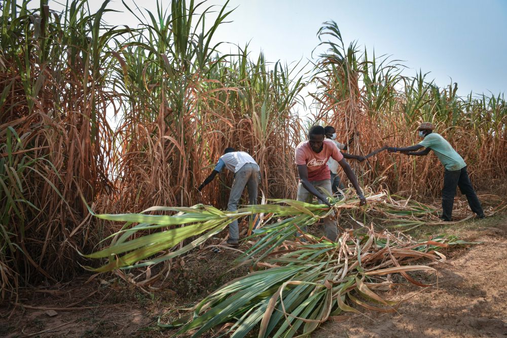 ↑当地农民在中非共和国班吉一处菌草田收获菌草。