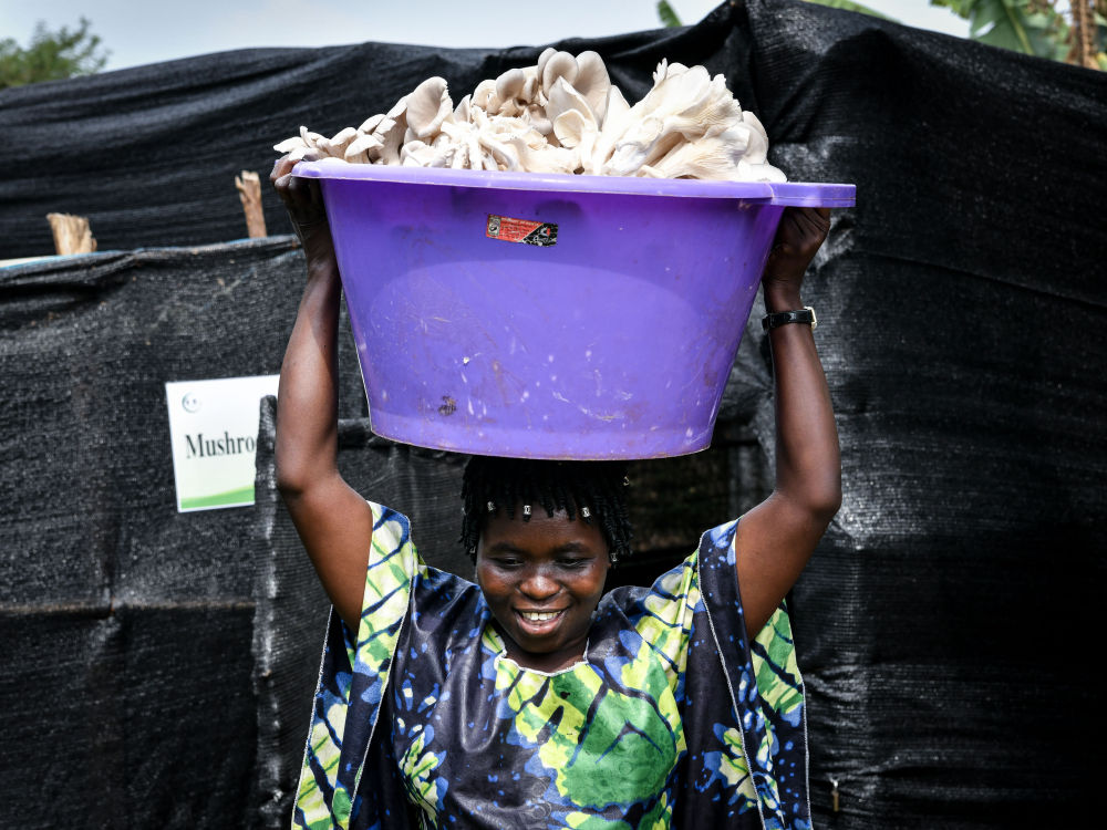 ↑法蒂玛在位于中非共和国达马拉的菇棚内收获菌菇。