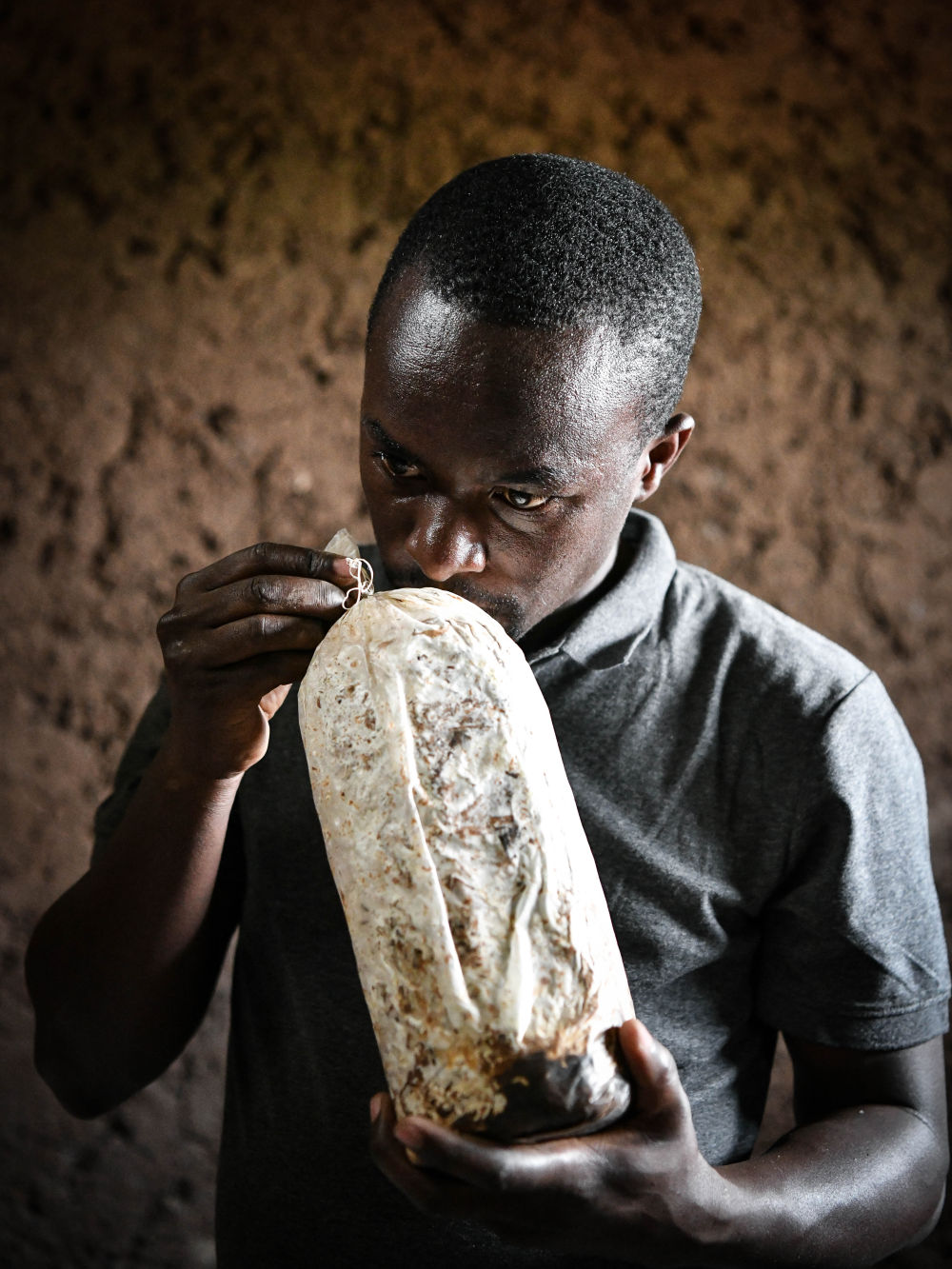 ↑尼扬博·奥贝德在卢旺达南方省的食用菌培育工坊内检查菌袋。