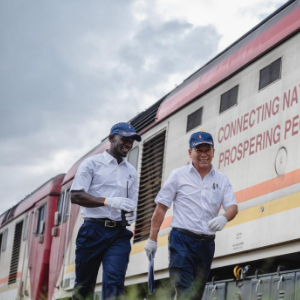 2023年5月23日,在肯尼亚内罗毕,非洲之星铁路运营公司机辆部的火车驾驶员蒋立平(右)与学员霍勒斯从蒙内铁路机车旁走过。新华社记者 王冠森 摄