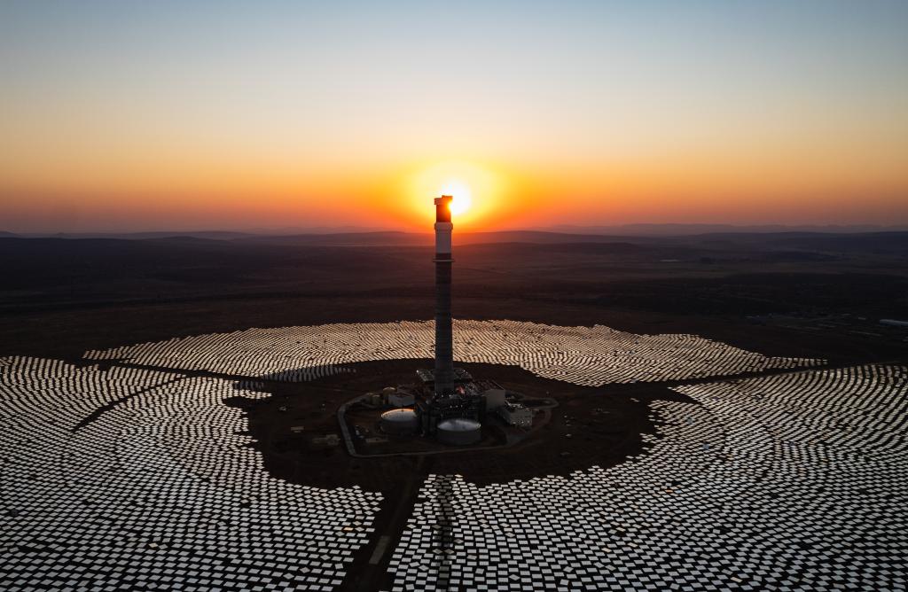 南非北开普省波斯特马斯堡镇,日照充足,土地开阔。南非最大的可再生能源项目——红石100兆瓦塔式熔盐光热电站宛如一朵巨大的向阳花,汇聚着太阳的光和热。
