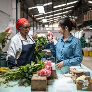 2024年5月18日,湖南玺悦国际贸易有限公司负责人黄梓楠(右)在肯尼亚纳纽基的坦布济花卉农场挑选鲜花。新华社记者 王冠森 摄