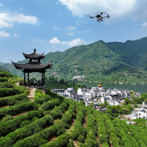 4月27日,在安徽省黄山市黄山区新明乡猴坑村,“90后”新农人项凡运用无人机帮助茶农在山区间运送农具、茶叶等货物。新华社记者 杜宇 摄