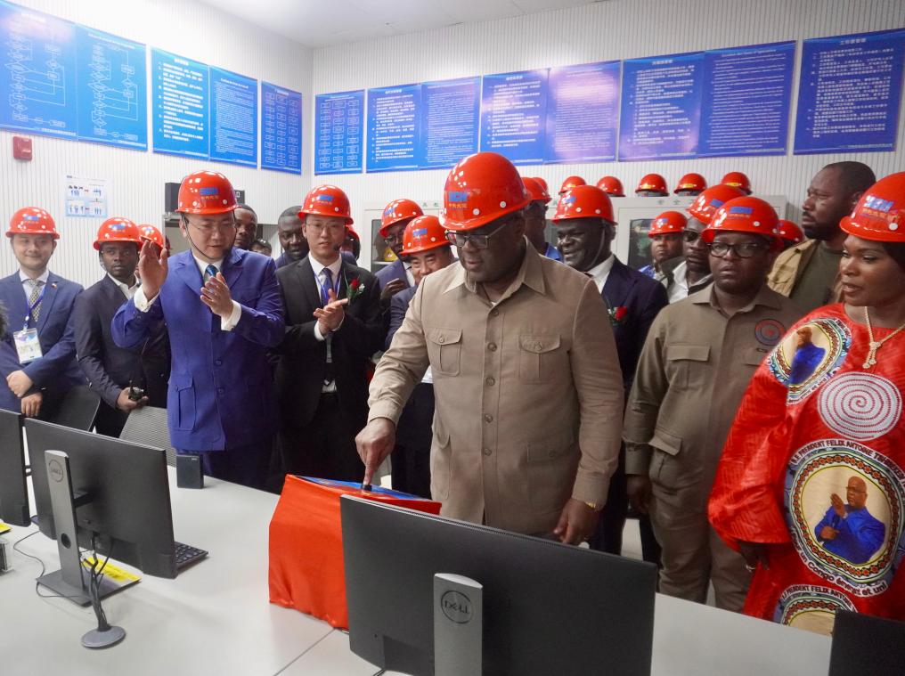 2023年10月6日,刚果(金)总统齐塞克迪(中)在位于卢阿拉巴省的布桑加水电站按下发电机组运行总按钮,这标志着布桑加水电站正式开始发电。新华社记者 史彧 摄