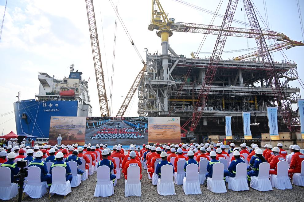 8月12日,各方代表在海洋石油工程(青岛)有限公司生产基地参加中方承建的沙特阿美马赞油气集输平台交付仪式。新华社记者李紫恒摄