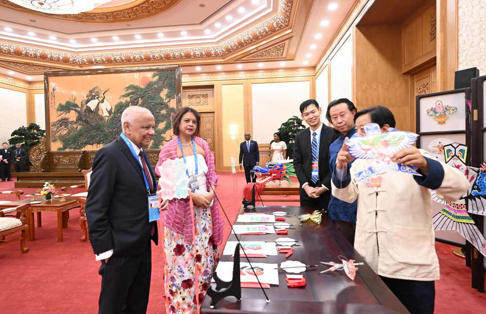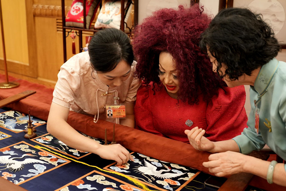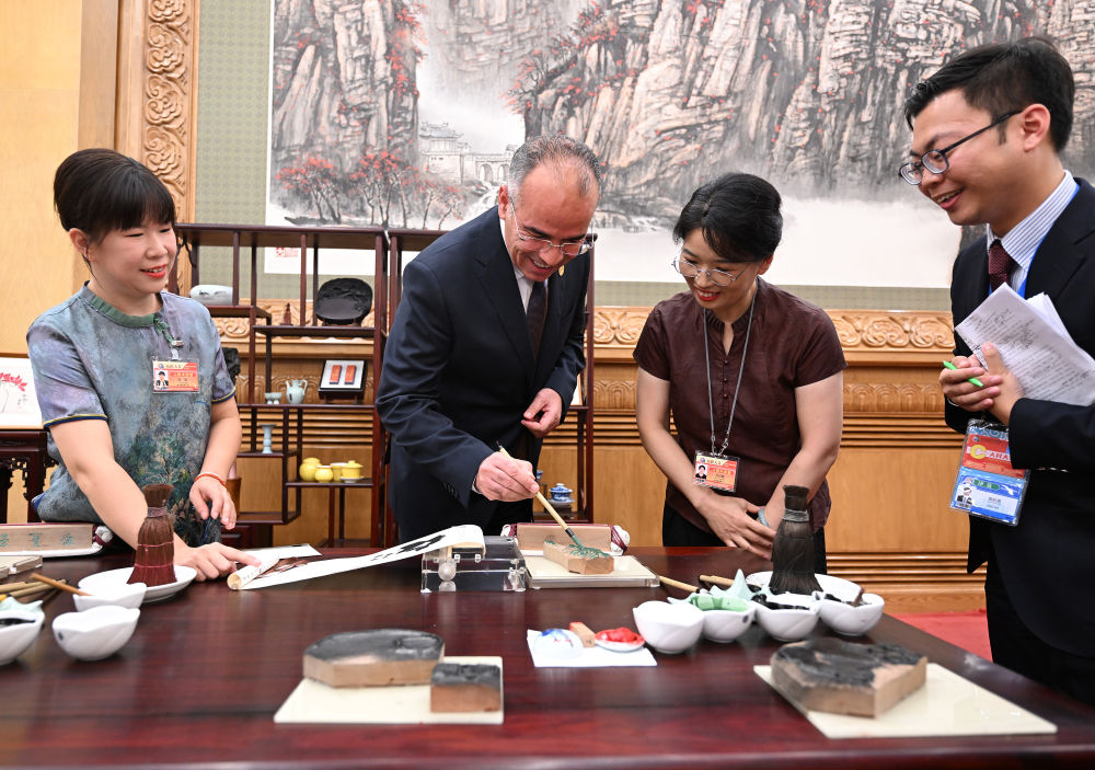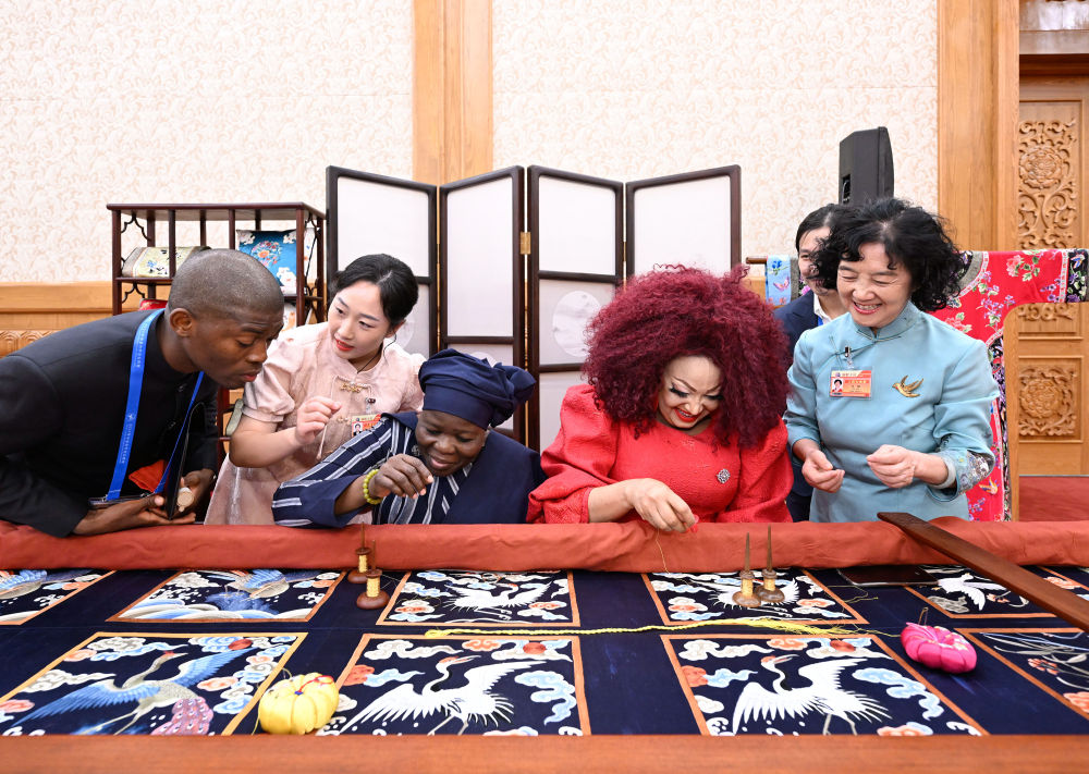 这是参加宴会的非方及国际贵宾体验中国传统非遗技艺。