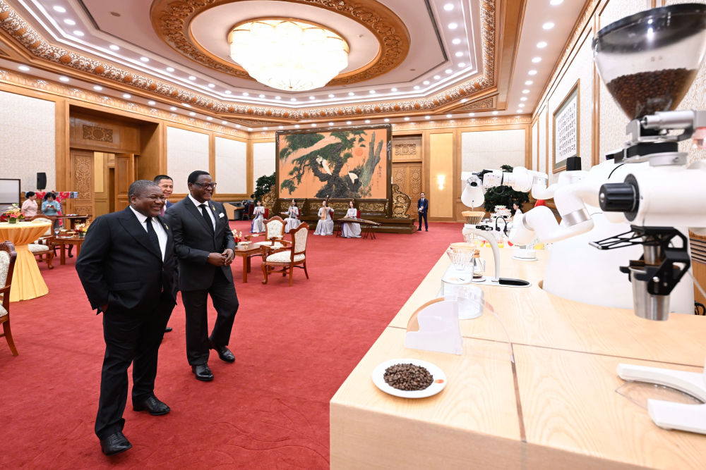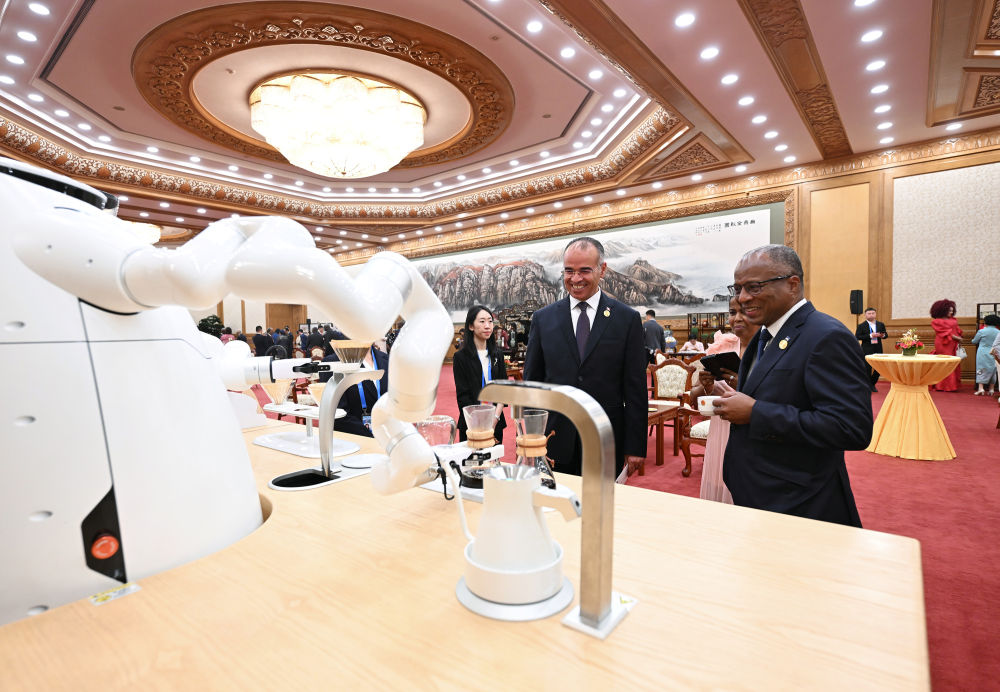 这是参加宴会的非方及国际贵宾观看自动咖啡机器人制作展示。