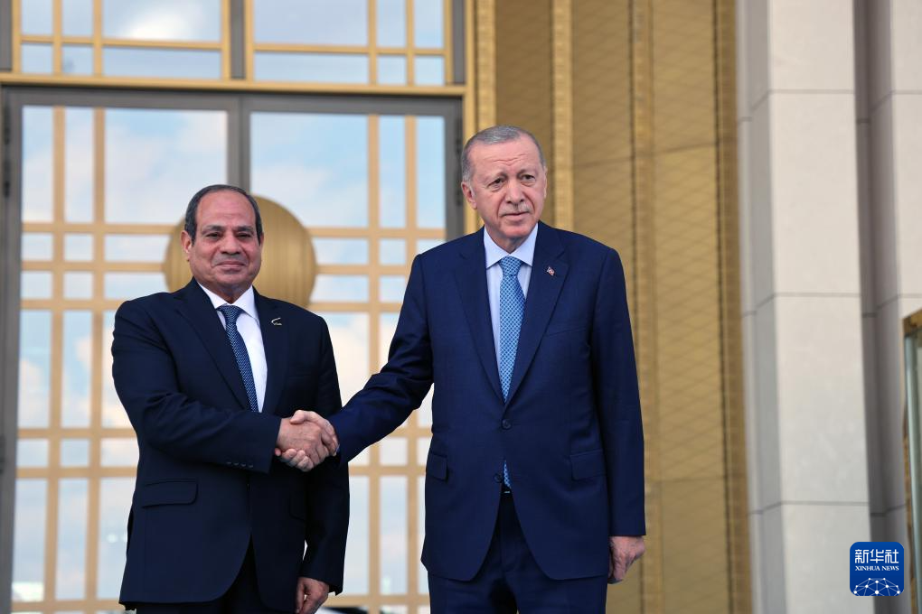 9月4日,在土耳其首都安卡拉,土耳其总统埃尔多安(右)与到访的埃及总统塞西握手。土耳其总统埃尔多安4日表示,土耳其和埃及两国在巴勒斯坦问题上有着共同立场。埃尔多安当天在首都安卡拉与到访的埃及总统塞西就双边关系和巴以局势等问题举行会谈,并共同主持两国高级别战略合作委员会成立会议。随后,两国领导人共同见证签署了一系列合作文件。新华社发(穆斯塔法·卡亚摄)
