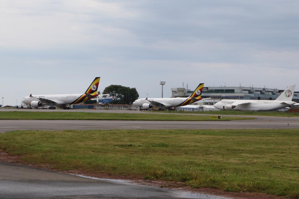 2021年10月6日,几架飞机停在乌干达恩德培国际机场新扩建的停机坪上。(新华社记者张改萍摄)