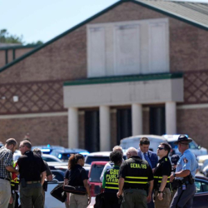 9月4日,在美国佐治亚州巴罗县温德市,警察聚集在发生枪击事件的阿巴拉契高中外。