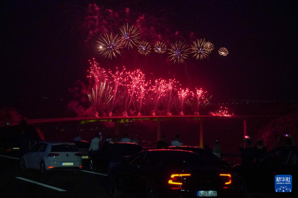 这是9月4日在波黑查普利纳拍摄的泛欧5C走廊高速公路波黑查普利纳段项目通车仪式上的焰火表演。 新华社记者 殷晓圣 摄