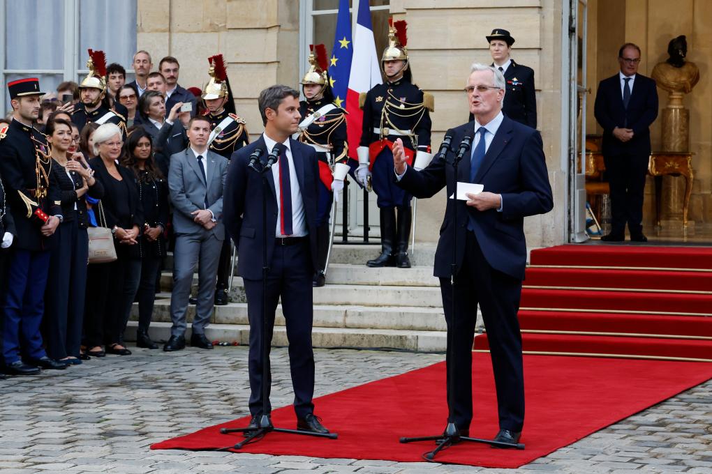9月5日,在法国巴黎的总理府,米歇尔·巴尼耶(前右)和即将卸任的总理阿塔尔(前左)出席交接仪式。新华社发(亨利·施瓦茨摄)