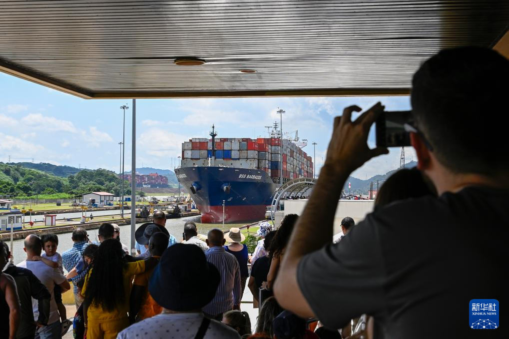 8月28日,在巴拿马首都巴拿马城附近,游客在巴拿马运河的米拉弗洛雷斯船闸游客中心观看货轮通过船闸驶入太平洋。