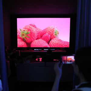 9月6日,在德国柏林国际消费电子展极米科技展区,参观者拍摄新款投影产品。