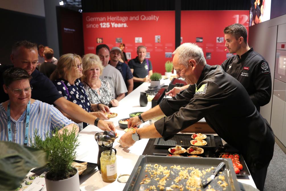 9月6日,在德国柏林国际消费电子展美诺展区,参观者品尝智慧厨房烹饪的美食。新华社记者杜哲宇摄