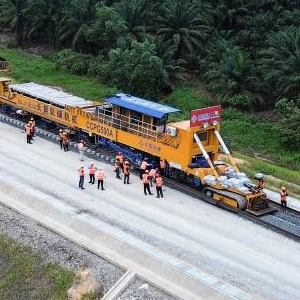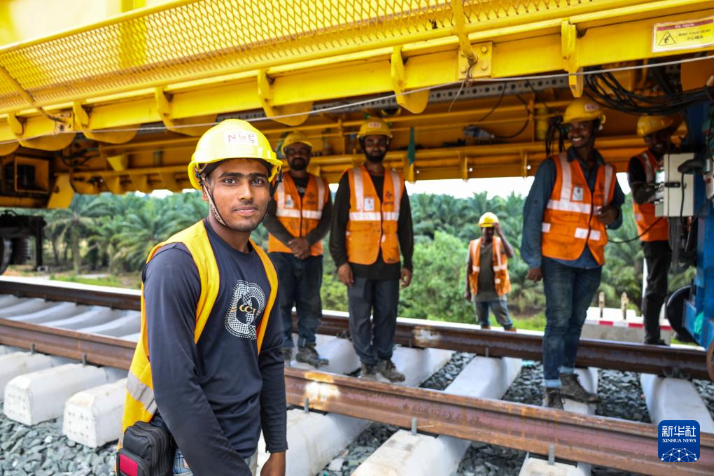 这是5月6日在马来西亚彭亨州拍摄的马东铁项目的铺轨工人。