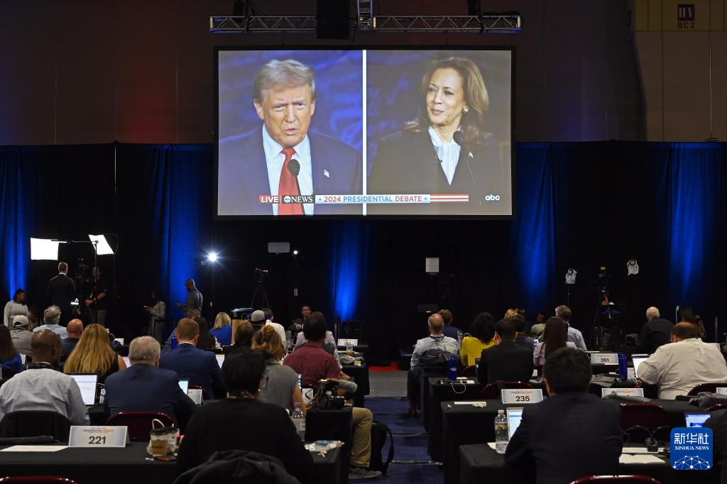 这张9月10日在美国费城总统辩论媒体中心拍摄的视频直播画面显示,美国民主党总统候选人、副总统哈里斯(右)与共和党总统候选人、前总统特朗普在费城参加电视辩论。新华社记者 李睿 摄