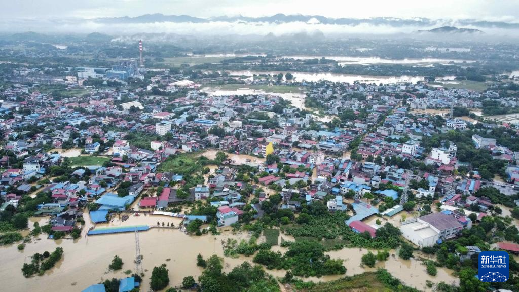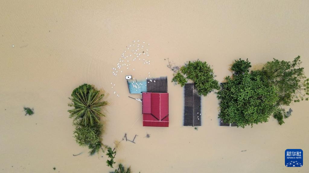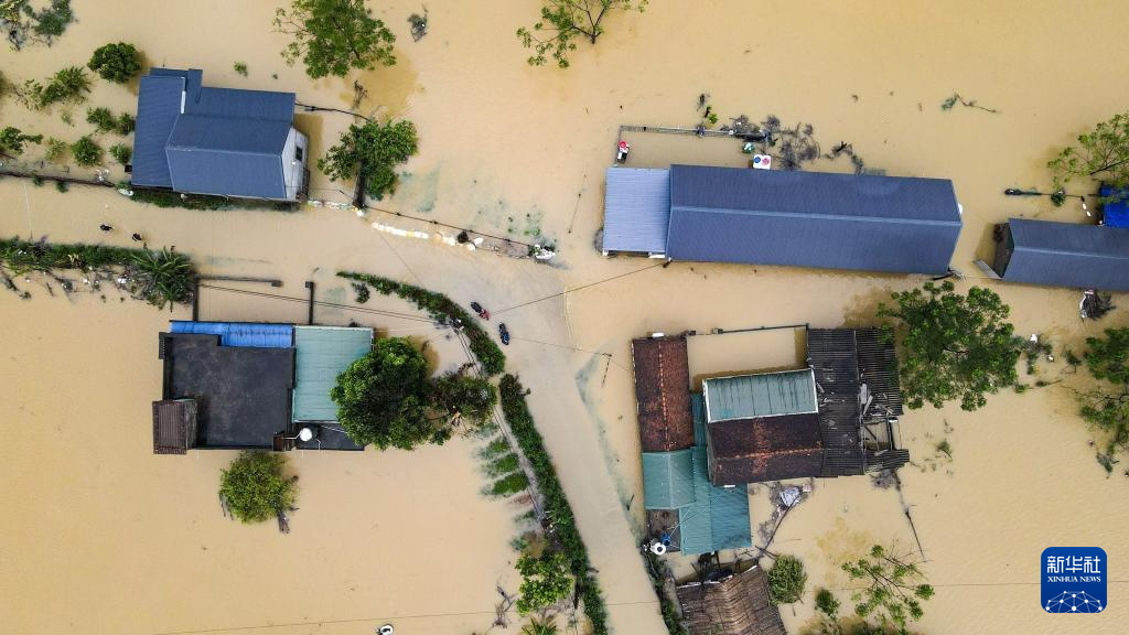 9月11日,在越南河内章美县,一些房屋被洪水淹没(航拍照片)。新华社/越通社