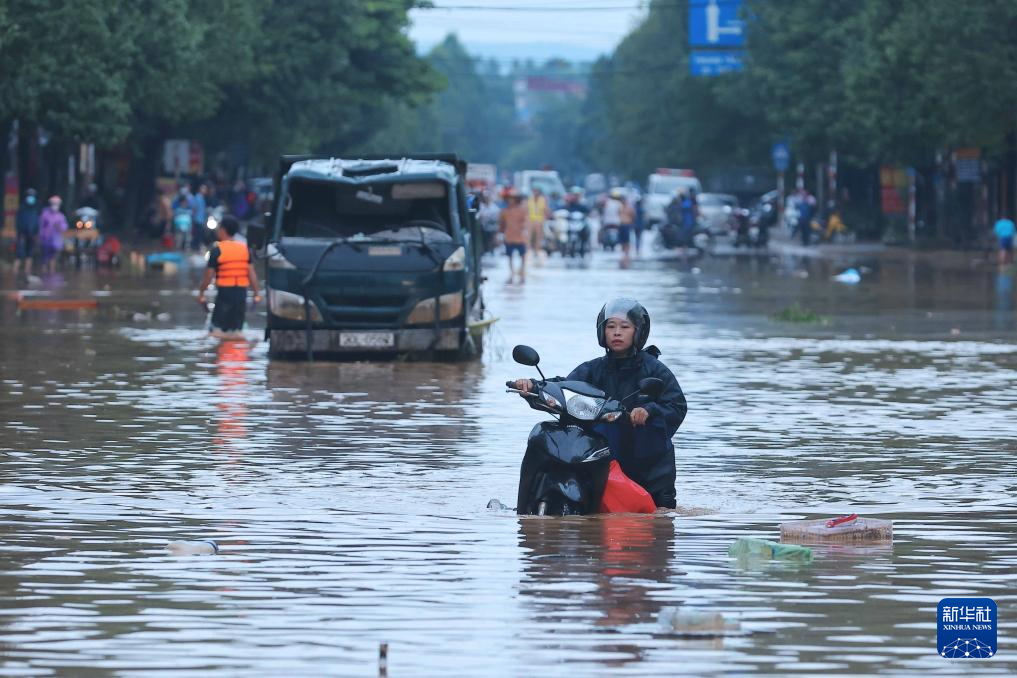 9月11日,在越南太原省太原市,人们在街道上涉水而行。新华社/越通社