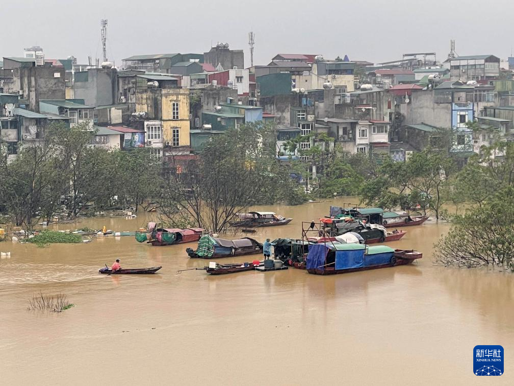 9月11日,在越南首都河内,因红河河水不断上涨,群众向安全地带转移。新华社/越通社