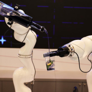 9月10日,在沙特阿拉伯首都利雅得举行的第三届全球人工智能峰会上,机械臂为人们制作饮品。