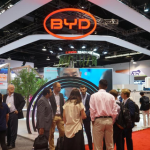 9月10日,在美国加利福尼亚州安纳海姆市,人们参观中国企业比亚迪在RE+展会的展区。