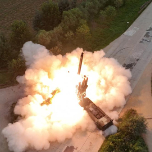 这张朝中社发布的照片显示的是金正恩现场观摩新型600毫米火箭炮车性能验证试射活动。