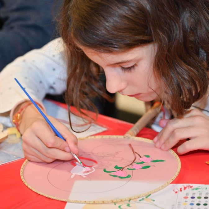 9月14日,在德国首都柏林,小朋友在“天涯共此时·中秋诗会”上体验扇面绘画。