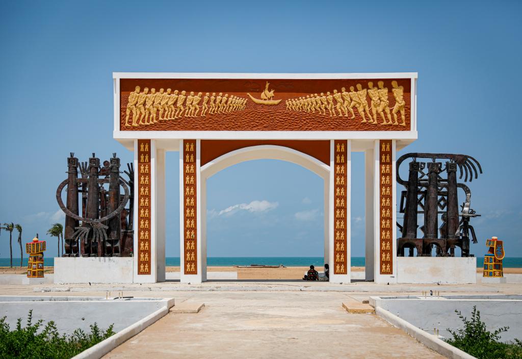 从加纳海岸角奴隶堡出发,沿海岸线向东行约450公里,贝宁维达古城的沙滩上矗立着又一座被称为“不归之门”的宏伟拱门,纪念从此地被贩卖至美洲的奴隶。