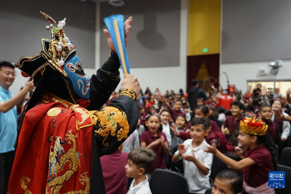 9月18日,在美国洛杉矶县,演员在“沃恩下世纪学习中心”学校表演川剧“变脸”。 新华社发(曾慧摄)