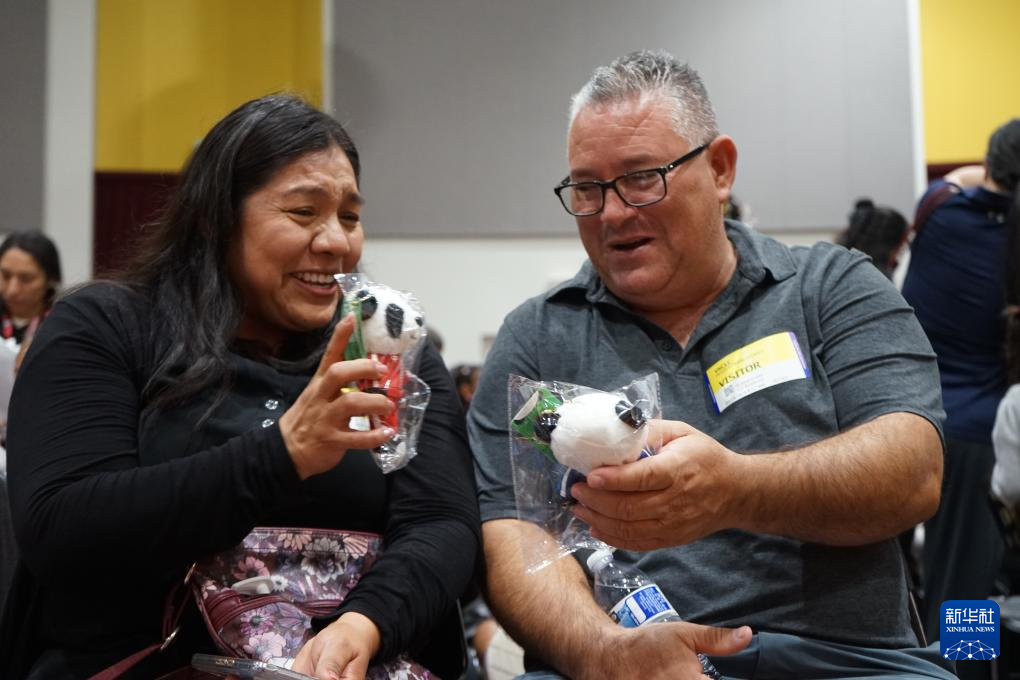 9月18日,在美国洛杉矶县,“沃恩下世纪学习中心”学校的学生家长收到熊猫玩偶作为纪念品。 新华社发(曾慧摄)