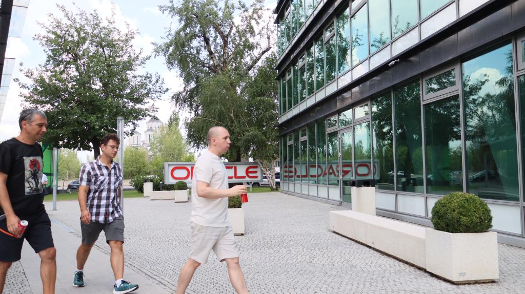 7月26日,在罗马尼亚首都布加勒斯特,人们走过甲骨文罗马尼亚公司在俄勒冈园区的办公大楼。新华社记者张改萍摄