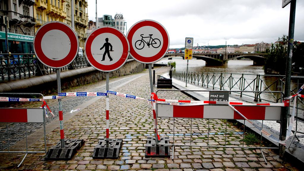 9月16日,在捷克首都布拉格的伏尔塔瓦河畔,由于河水上涨,通往河堤的道路被封闭。新华社发(达娜·科什奈洛娃摄)