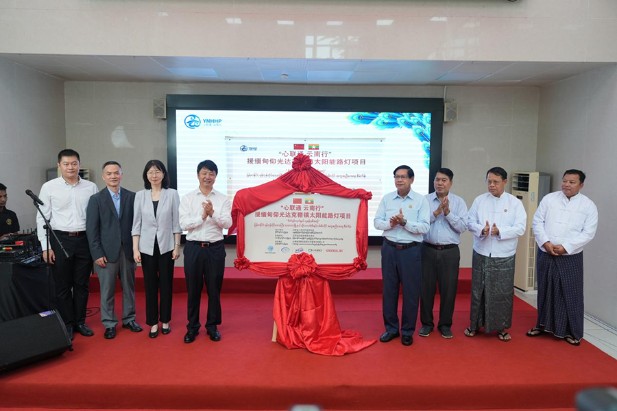 在仪式现场,中缅代表为“心联通 云南行”缅甸仰光达吉达镇太阳能路灯项目揭牌。