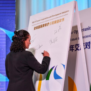 9月25日,在俄罗斯喀山,金砖国家青年代表在现场展板上签字。