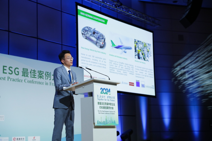 图片说明:太仓高新区驻法兰克福代表处招商经理王宇鹏在近期举办的首届中欧企业ESG最佳案例大会上进行主题分享发言。