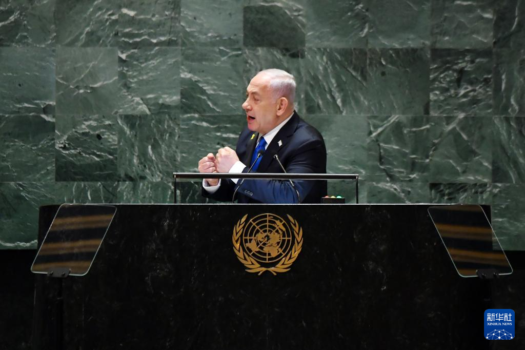 9月27日,在位于纽约的联合国总部,以色列总理内塔尼亚胡在第79届联大一般性辩论上发言。新华社记者 李睿 摄