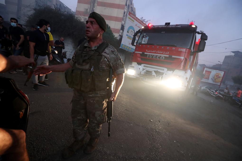 9月27日,士兵在黎巴嫩首都贝鲁特南郊以军空袭现场警戒。新华社发(比拉尔·贾维希摄)