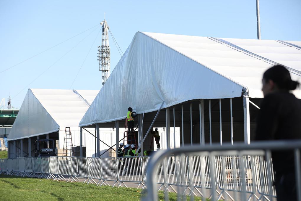 2022年10月9日,工人在位于美国纽约市兰德尔岛的移民救援中心建设工地工作。新华社记者王迎摄