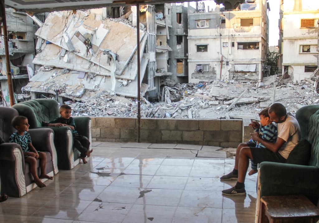 10月6日,在加沙地带北部杰巴利耶,人们坐在建筑废墟附近。新华社发(马哈茂德·扎基摄)