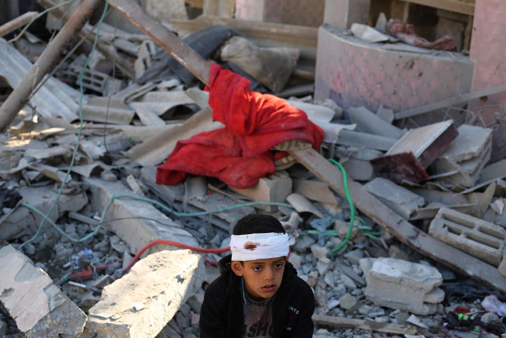 1月18日,在加沙地带南部城市拉法,一名受伤的男孩坐在空袭过后的废墟上。新华社发(哈立德·奥马尔摄)