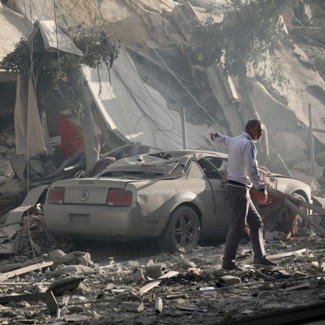 10月3日,在黎巴嫩首都贝鲁特,男子指向空袭过后废墟中的余火。新华社发(比拉尔·贾维希摄)