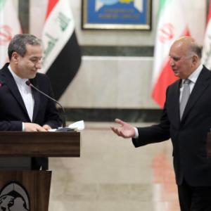 10月13日,伊拉克外长侯赛因(右)同到访的伊朗外长阿拉格齐在首都巴格达举行会谈后参加联合记者会。